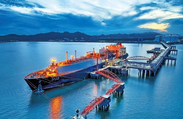绿色低碳是新型工业化的生态底色。图为2024年9月8日,满载7.2万吨液化天然气的“中能北海”号靠泊中国石化天然气分公司华瀛液化天然气接收站进行接卸,这标志着中国石化在广东的首个液化天然气项目正式投运。 人民图片 胡庆明/摄